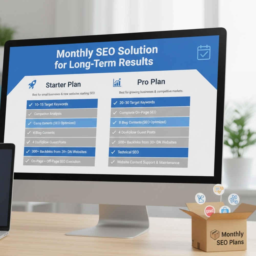 A complete monthly SEO solution designed to improve keyword rankings, traffic, visibility, and leads using a structured on-page and off-page SEO strategy. Choose between Starter and Pro plans based on your growth goals.